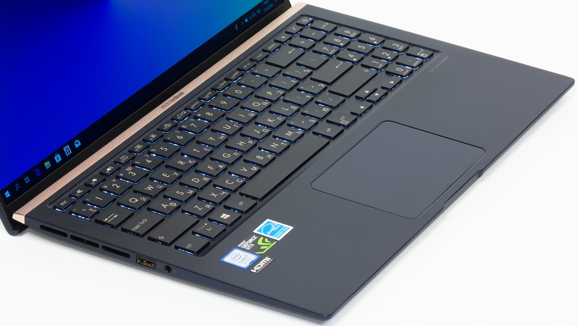 В Asus ZenBook 15 UX533FD используется ставшая уже традиционной для современных ноутбуков клавиатура островного типа с увеличенным расстоянием между клавишами. Клавиши имеют размер 15,5×15,5 мм, а расстояние между ними — 3,5 мм. Глубина нажатия (ход клавиш) составляет 1,4 мм. Символы на клавишах имеют золотистый цвет. На черном фоне клавиш эти символы хорошо различимы даже в условиях плохого освещения.
