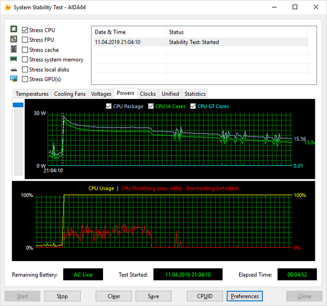 Температура ядер процессор в таком режиме составляет 80 °C, а мощность энергопотребления постепенно снижается до 15 Вт. Причем, по показаниям утилиты AIDA64, в этом режиме загрузки первоначально наблюдается троттлинг. Все дело в том, что ноутбук не спешит включать вентиляторы и поначалу даже в режиме стрессовой загрузки работает очень тихо. Когда вентиляторы включаются, троттлинг пропадает.