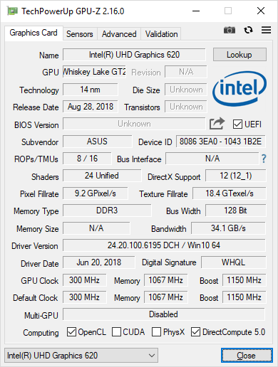 Итак, основой нашей модификации ноутбука ZenBook 15 UX533FD является четырехъядерный процессор Intel Core i7-8565U (Whiskey Lake). Он имеет номинальную тактовую частоту 1,8 ГГц, которая в режиме Turbo Boost может повышаться до 4,6 ГГц. Процессор поддерживает технологию Hyper-Threading. Размер его кэша L3 составляет 8 МБ, а TDP — 15 Вт. В этот процессор интегрировано графическое ядро Intel UHD Graphics 620.