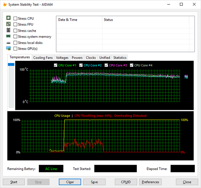 И опять-таки, по показаниям утилиты AIDA64, в этом режиме загрузки первоначально, пока ноутбук работает тихо, наблюдается троттлинг.