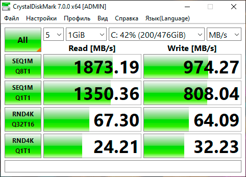 Скоростные характеристики SSD мы проверили в трех популярных бенчмарках при работе от адаптера питания (слева) и от встроенного аккумулятора (справа). Как выяснилось, они отличаются незначительно.