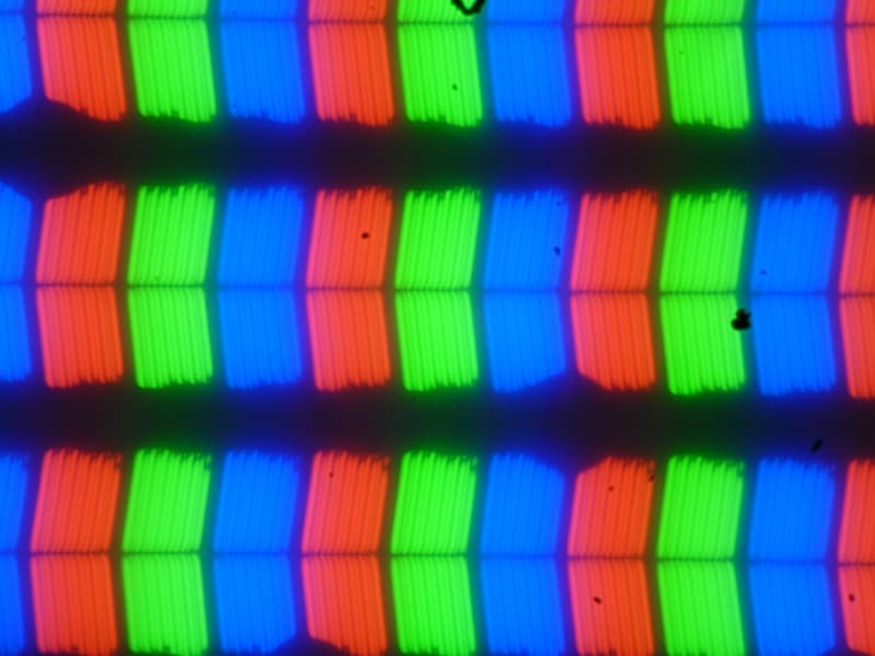 В этом ноутбуке используется матрица типа IPS. Микрофотографии демонстрируют типичную для IPS структуру субпикселей (черные точки — это пыль на матрице фотоаппарата):