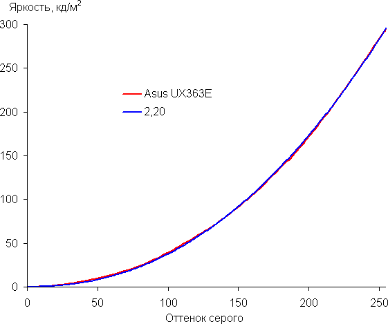 При питании от сети или от батареи и при ручном управлении яркостью (автоматической подстройки по датчику освещенности нет) ее максимальное значение составило 296 кд/м² (в центре экрана на белом фоне). Максимальная яркость не очень высокая. Впрочем, если избегать прямого солнечного света, то даже такое значение позволит как-то использовать ноутбук на улице летним солнечным днем.