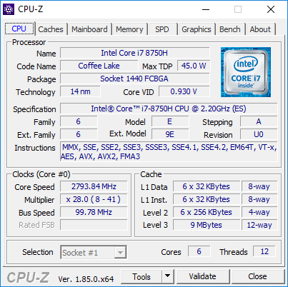 Итак, основой ноутбука Asus ROG Zephyrus M GM501GM является шестиядерный процессор Intel Core i7-8750H (Coffee Lake). Он имеет номинальную тактовую частоту 2,2 ГГц, которая в режиме Turbo Boost может повышаться до 4,1 ГГц. Процессор поддерживает технологию Hyper-Threading (что дает суммарно 12 потоков), размер его кэша L3 составляет 9 МБ, а расчетная мощность — 45 Вт. В этот процессор интегрировано графическое ядро Intel UHD Graphics 630.