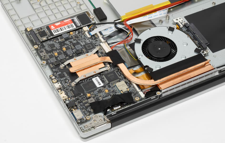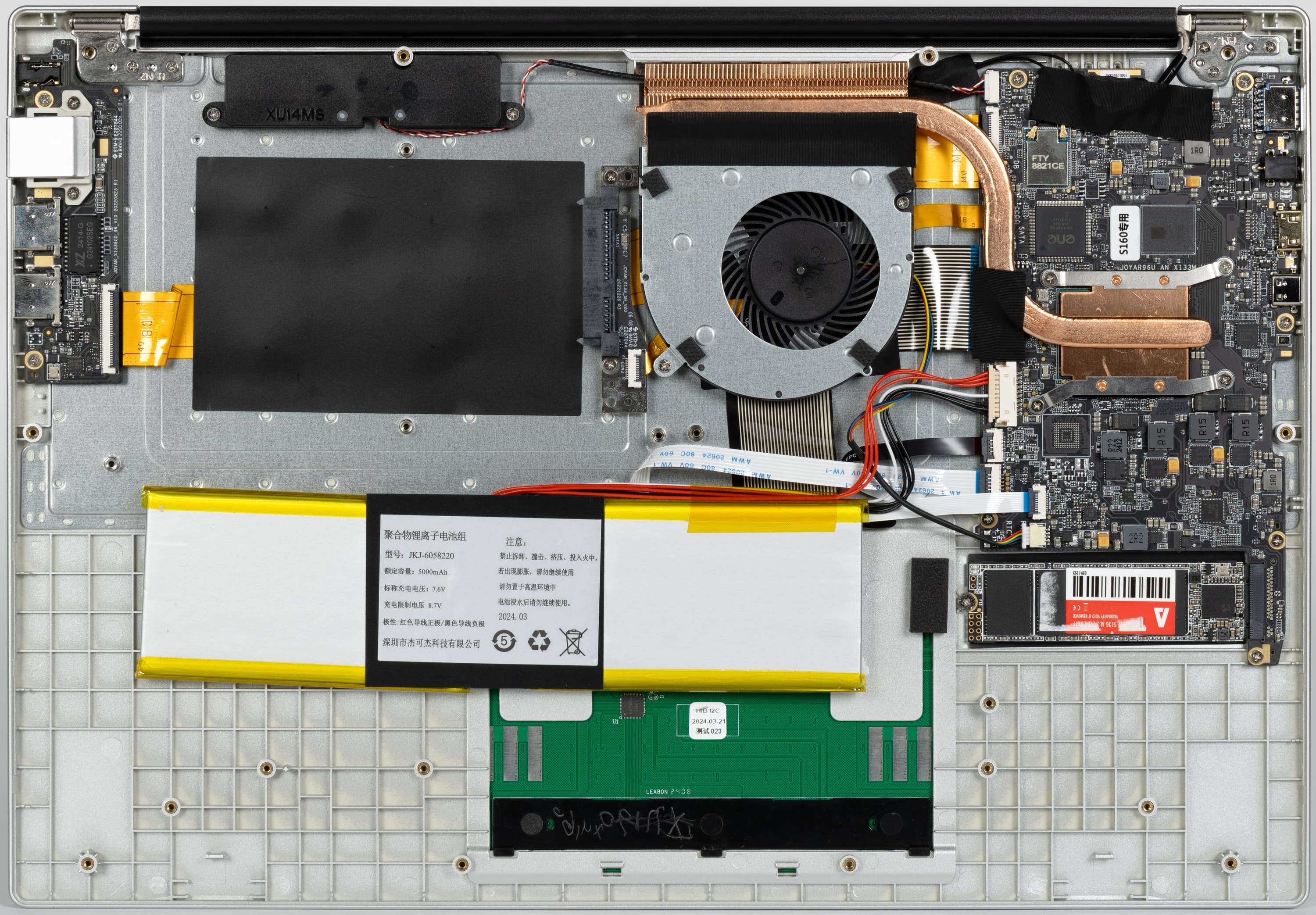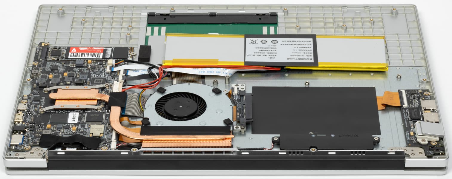 Простор внутри буквально поражает. Все элементы начинки едва ли занимают больше ⅓ внутреннего объема корпуса. По размерам доминируют система охлаждения и аккумулятор. Качество сборки посредственное. Аккумулятор кое-как собран из двух элементов, закреплен при помощи клейкой ленты, а не винтов или защелок (и посажен сикось-накось). Провода и шлейфы висят без опор, лишь провод антенны беспроводного адаптера (на фото — справа вверху) закреплен «липучкой», которая, кстати говоря, приклеена к текстолиту системной платы поверх элементов схемотехники.