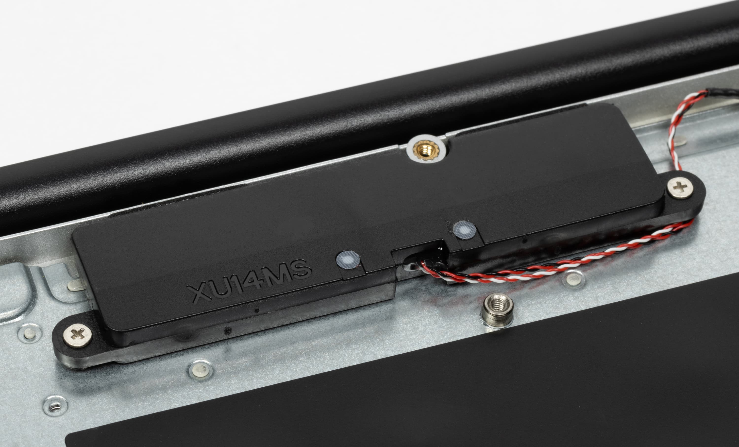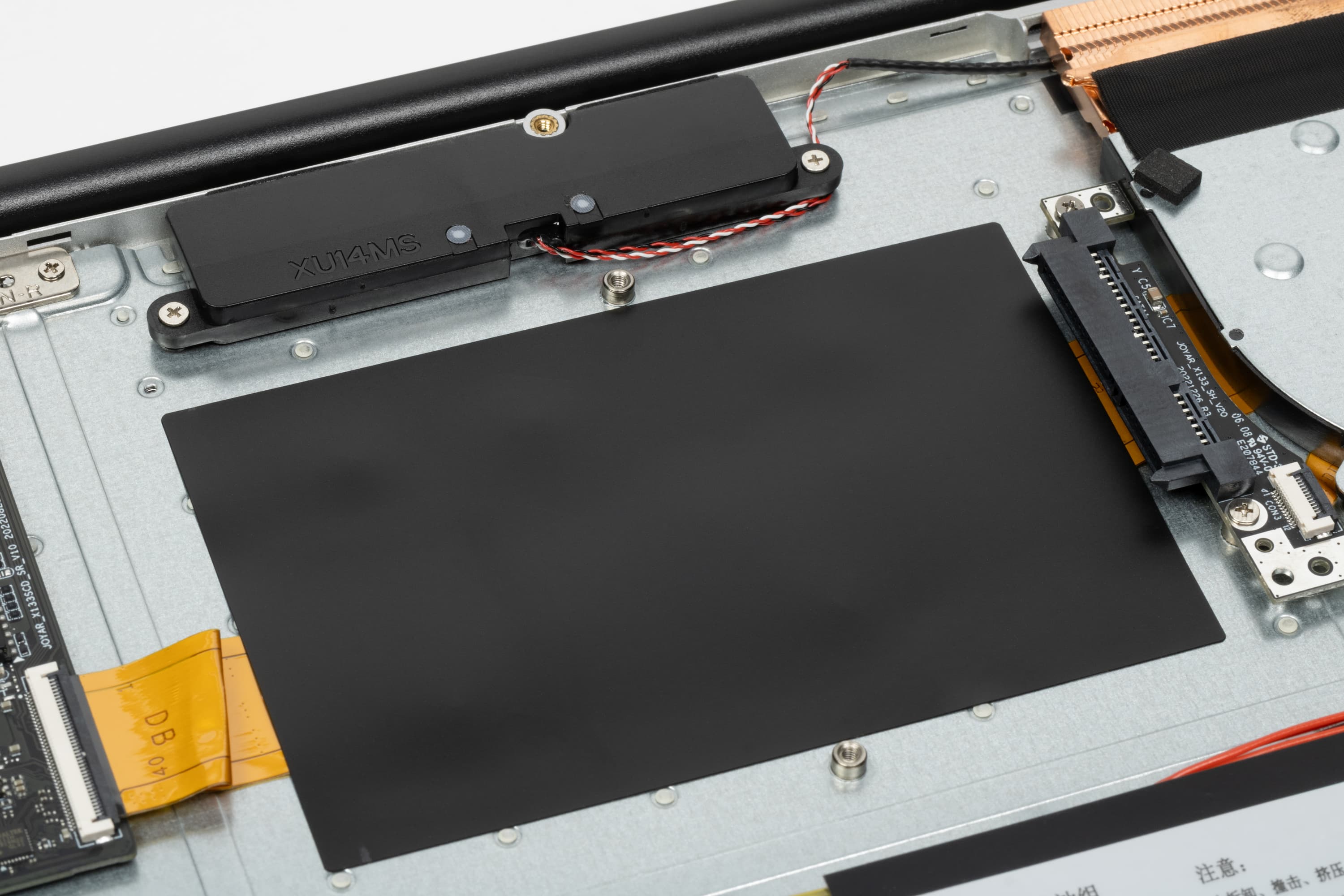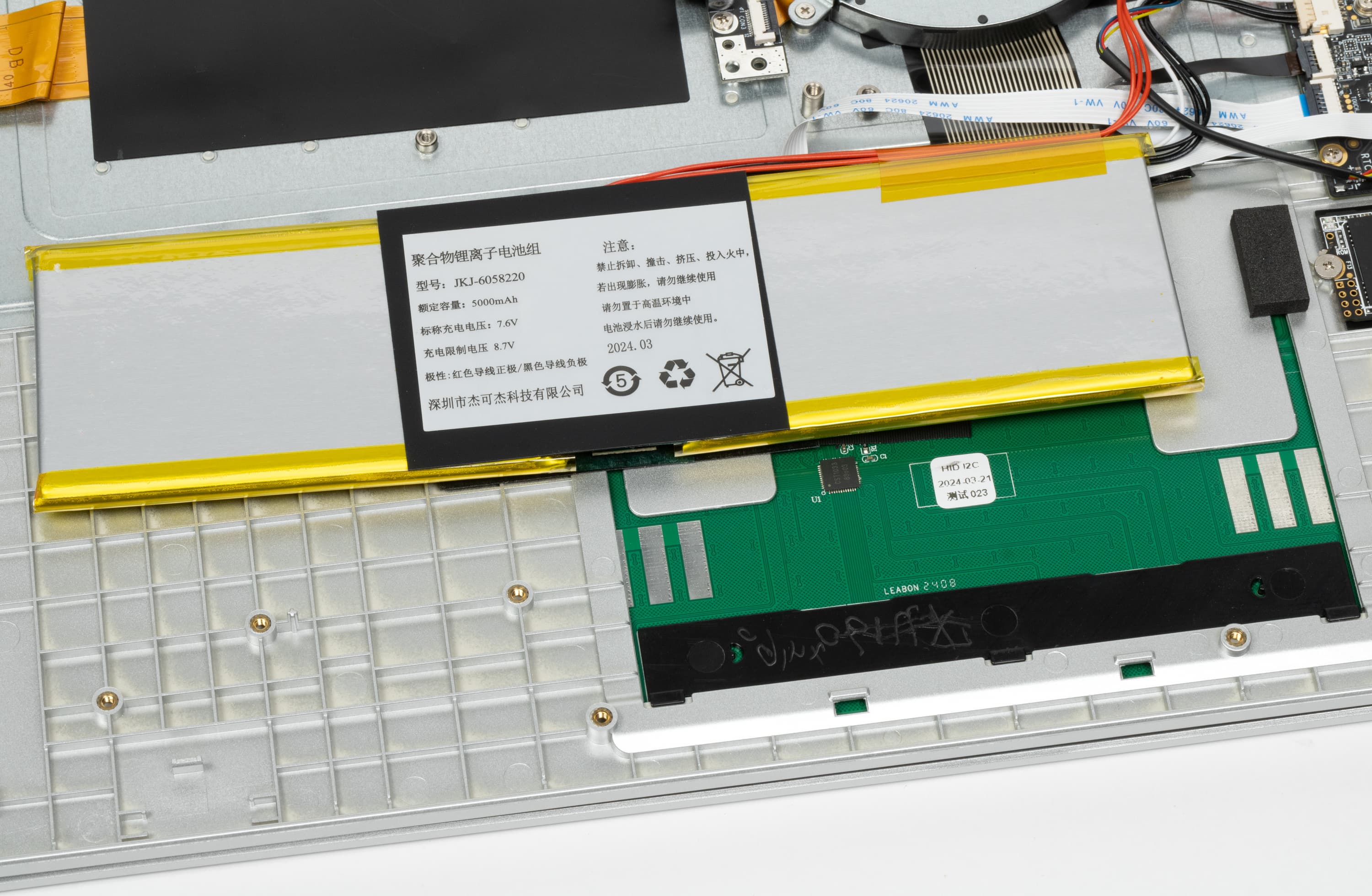 Простор внутри буквально поражает. Все элементы начинки едва ли занимают больше ⅓ внутреннего объема корпуса. По размерам доминируют система охлаждения и аккумулятор. Качество сборки посредственное. Аккумулятор кое-как собран из двух элементов, закреплен при помощи клейкой ленты, а не винтов или защелок (и посажен сикось-накось). Провода и шлейфы висят без опор, лишь провод антенны беспроводного адаптера (на фото — справа вверху) закреплен «липучкой», которая, кстати говоря, приклеена к текстолиту системной платы поверх элементов схемотехники.