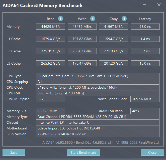 Прибегнем к тестированию быстродействия оперативной памяти и кеша при помощи встроенного бенчмарка популярной утилиты AIDA64.