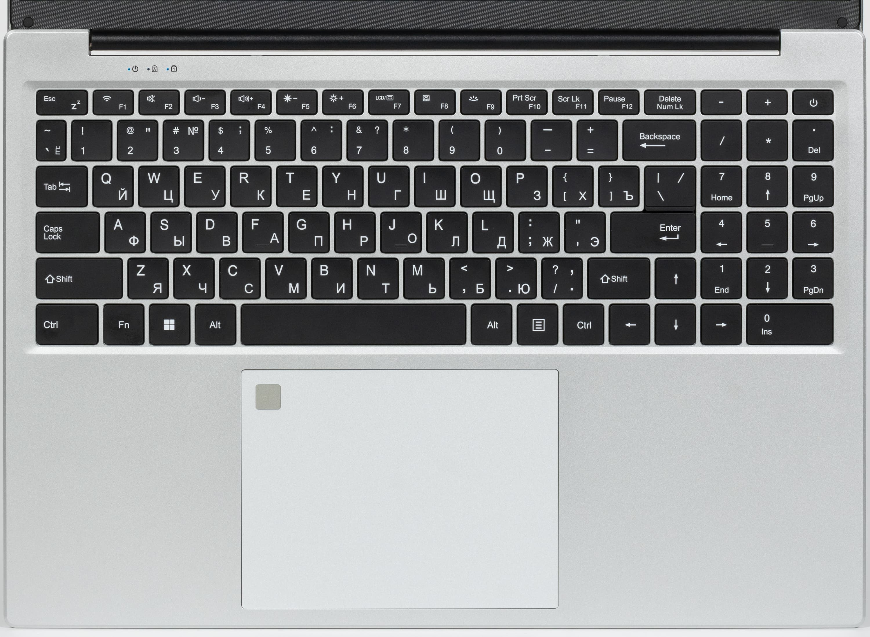 Слева над верхним рядом клавиатуры размещены светодиодные индикаторы, сигнализирующие о включенном питании ноутбука и состоянии регистров Caps Lock и Num Lock.