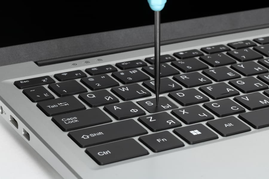 Кнопка выключателя питания расположена в верхнем ряду клавиатуры крайней справа. По форме и размерам она повторяет соседей слева, поэтому при работе вслепую ее можно перепутать с другими и нажать по ошибке.