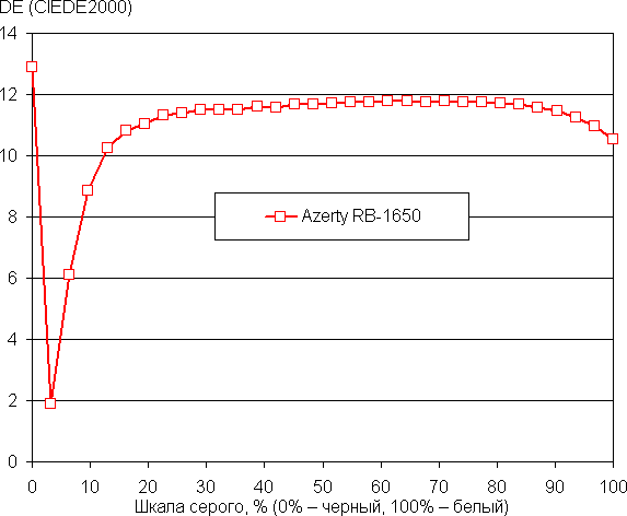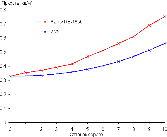 Рост прироста яркости на большей части шкалы серого более-менее равномерный, и каждый следующий оттенок ярче предыдущего, за исключением трех самых светлых оттенков, которые по яркости от белого не отличаются. В самой темной области аппаратно и визуально хорошо различаются все оттенки: