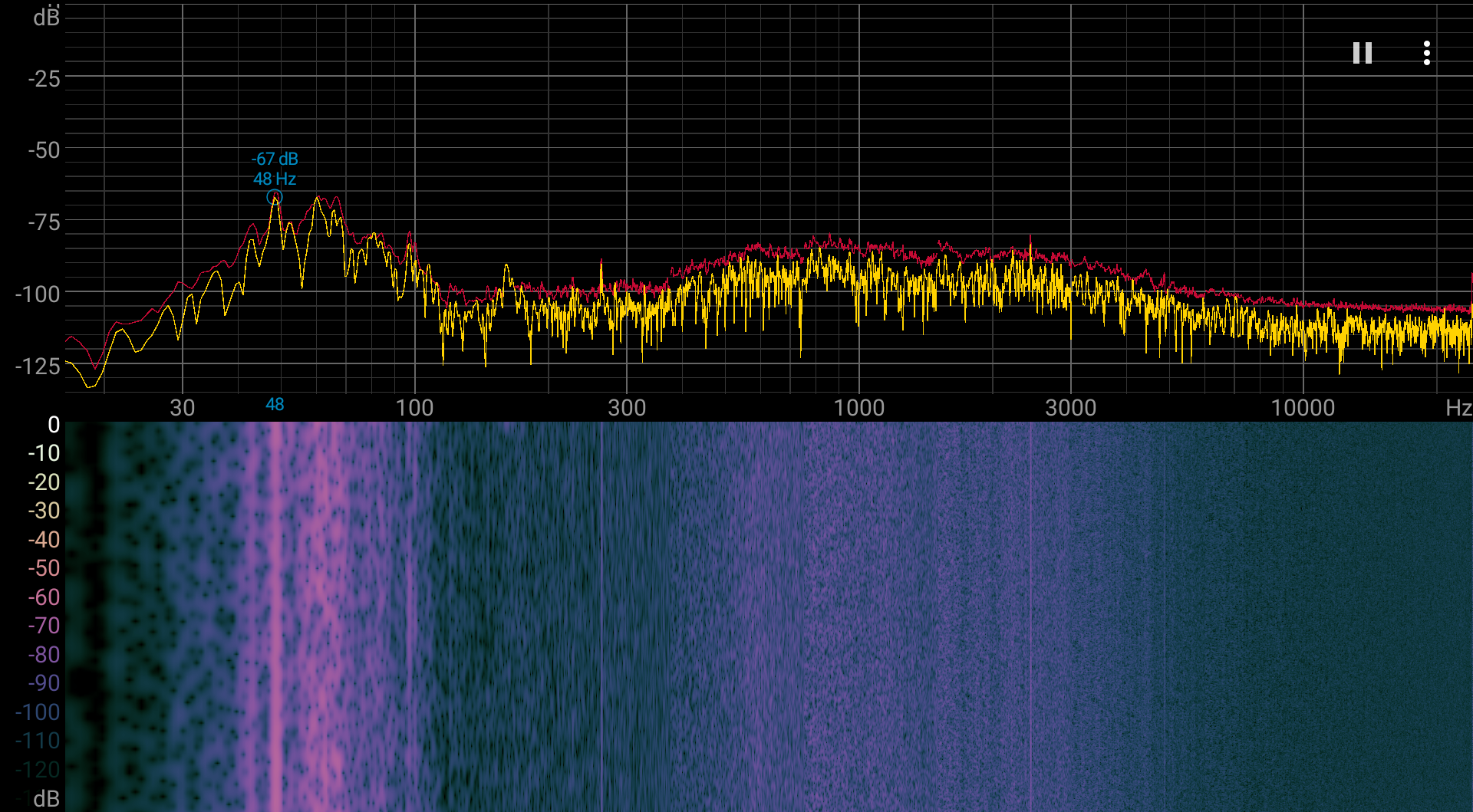Если ноутбук не нагружать совсем, то его система охлаждения в указанных выше условиях может работать в пассивном режиме. Характер шума даже под высокой нагрузкой ровный и раздражения не вызывает. Спектрограмма, полученная под высокой нагрузкой, достаточно ровная, и в диапазоне частот, где звуки могут вызывать особенное раздражение, интенсивных пиков нет: