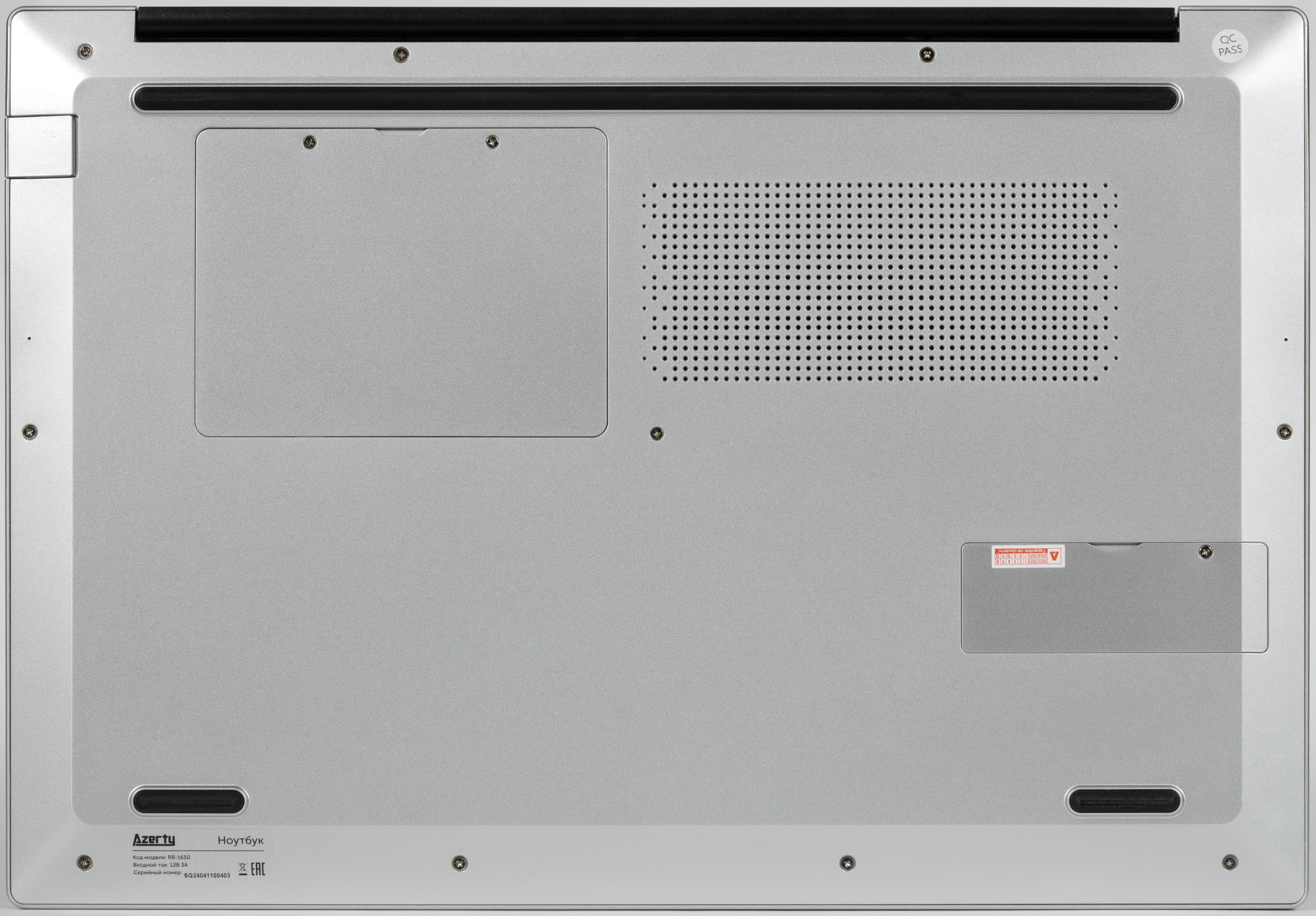 Снизу заметны черные резиновые опоры: цельная длинная задняя и две маленькие передние. Решетка воздухозаборника системы охлаждения отличается весьма небольшой площадью. Имеются две крышки для доступа к накопителям: большая для устройства форм-фактора 2,5 дюйма и маленькая для устройства в разъеме М.2. Для демонтажа днища потребуется обычная отвертка с крестообразным шлицем (Philips Type). С ее помощью нужно отвернуть 12 винтов по периметру днища плюс один винт в центре, а также 4 винта, крепящие крышки отсеков для накопителей. Головки двух винтов заклеены стикерами.