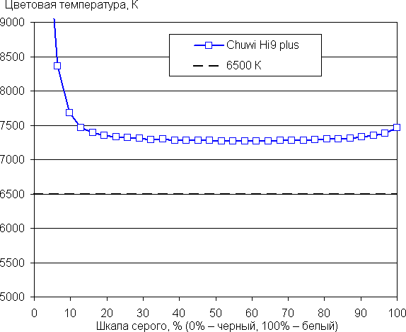 Баланс оттенков на шкале серого хороший, поскольку цветовая температура несильно выше стандартных 6500 К, а отклонение от спектра абсолютно черного тела (ΔE) ниже 10, что для потребительского устройства считается неплохим показателем. При этом цветовая температура и ΔE мало изменяются от оттенка к оттенку — это положительно сказывается на визуальной оценке цветового баланса. (Самые темные области шкалы серого можно не учитывать, так как там баланс цветов не имеет большого значения, да и погрешность измерений цветовых характеристик на низкой яркости большая.)