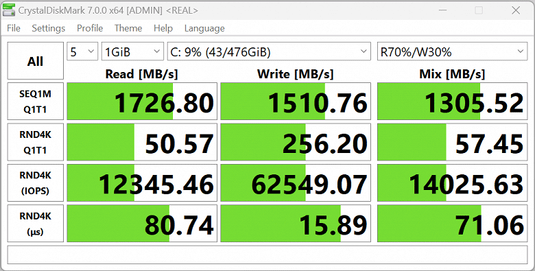 Накопитель тоже не особо порадовал: в соответствующих тестах он показал лишь средние результаты среди аппаратов с NVMe SSD.
