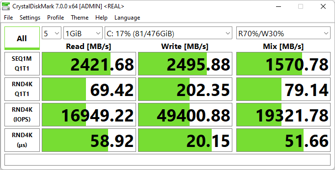 Системный накопитель нашего подопечного расплачивается за несовершенство и отсталость интерфейса: SATA не в состоянии тягаться с PCI Express, и этим обусловлен проигрыш Digma Pro Fortis M в заочном соревновании системных накопителей. Превосходство над ним победителя (Infinix Inbook X2 Plus) пятикратное, а серебряного призера состязаний (MSI Modern 15) — почти трехкратное.