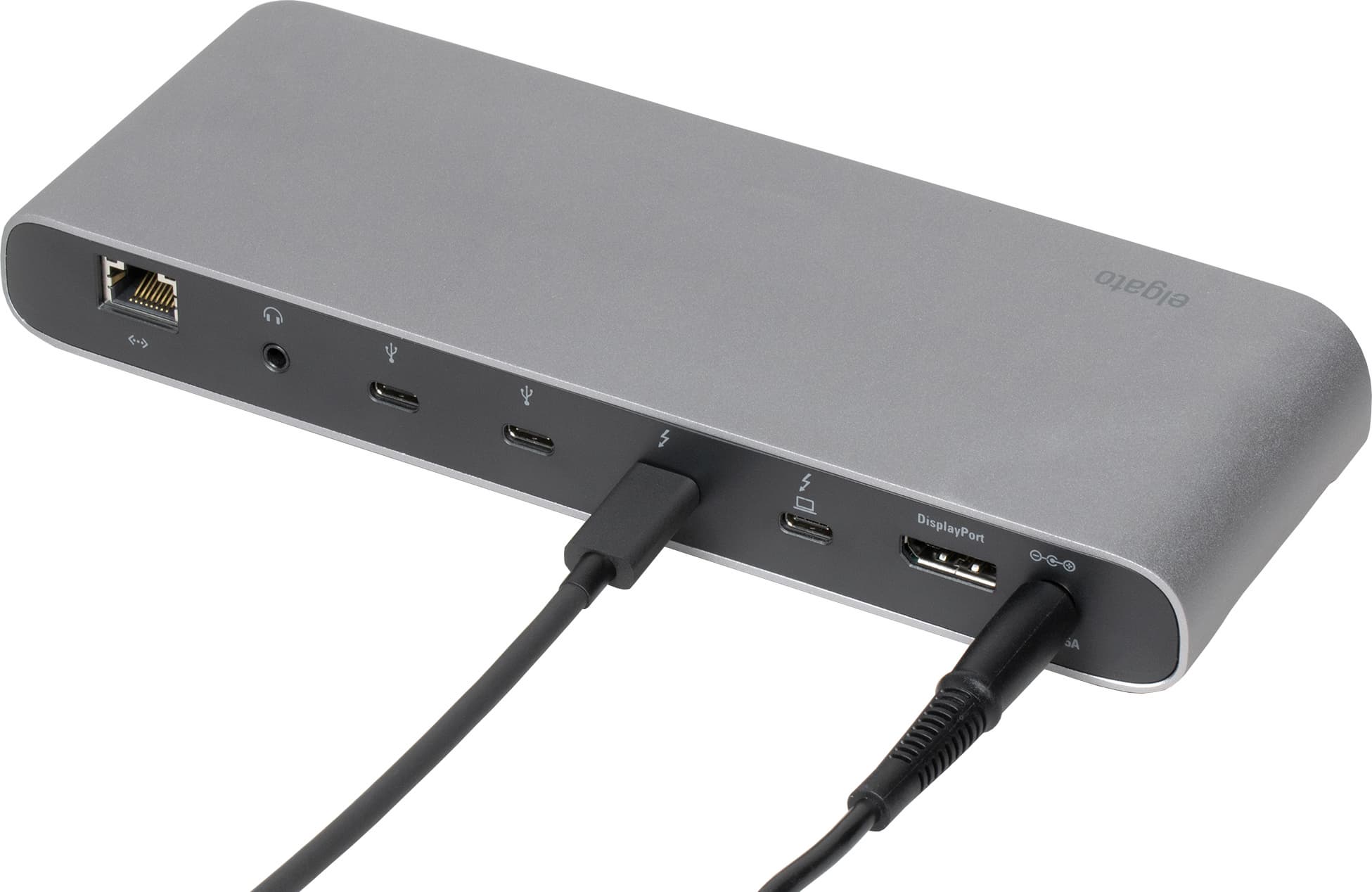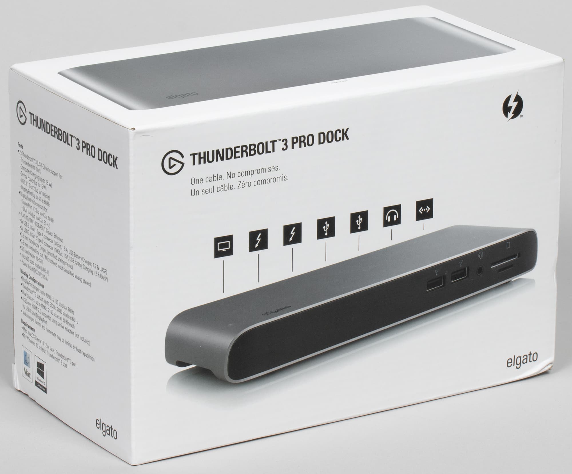 Даже портативные. К примеру, изученный нами два года назад Elgato Thunderbolt 3 Mini Dock, обеспечивающий пользователя двумя стандартными разъемами DisplayPort и HDMI 2.0 (с поддержкой двух устройств 4К@60 при 10-битном цвете), портом USB3 Gen1 A-типа и гигабитным Ethernet. Все это упаковывалось в компактные размеры (105×57×25 мм при массе 25 г) и снабжалось неотделяемым кабелем длинной 12 см. Удобно в поездках, но плохо подходит для стационарного использования — ни тебе цепочечного Thunderbolt, ни питания, да и USB-портов маловато, причем вообще без «быстрых». Но произошло так не из-за какой-то вредности производителя — просто для стационарного использования предназначена другая его модель, появившаяся примерно в то же время, а именно Thunderbolt 3 Pro Dock. Сегодня мы и до нее добрались.