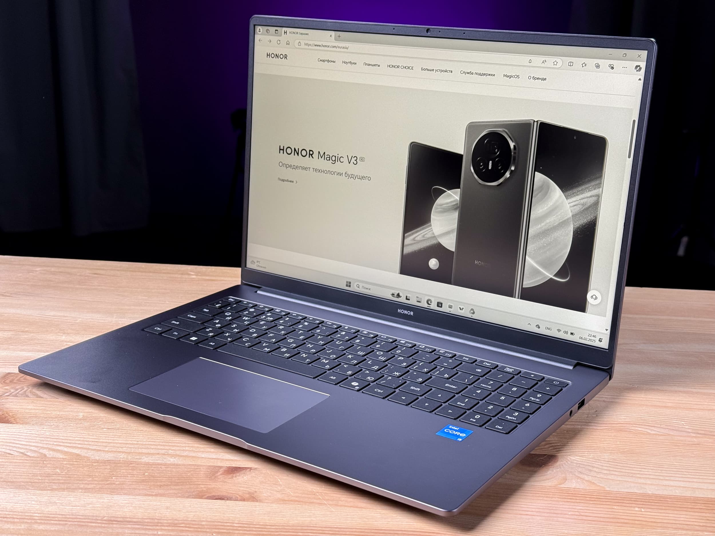 Корпус алюминиевый — прочный, неброский и легкий. При весе 1,75 кг и толщине не более 20 мм ноутбук легко помещается в рюкзак и не ощущается громоздким. Клавиатура полноразмерная, с крупными клавишами и мягким ходом — удобно для начинающих пользователей, которым еще только предстоит освоить печать. Экран раскрывается на 180 градусов, так что устройство можно подстроить под любой стол или рабочее место. Показатели шума и нагрева уверенно неплохие для рассматриваемого ценового сегмента, заряда хватает целый день работы с текстом, а 65-ваттная быстрая зарядка быстро восстанавливает его работоспособность. Есть все нужные разъемы: USB-A, USB-C, HDMI и аудио. А если дома уже есть другие гаджеты Honor, файлы можно передавать напрямую через Magic-link — без лишних кабелей и файлообменников.