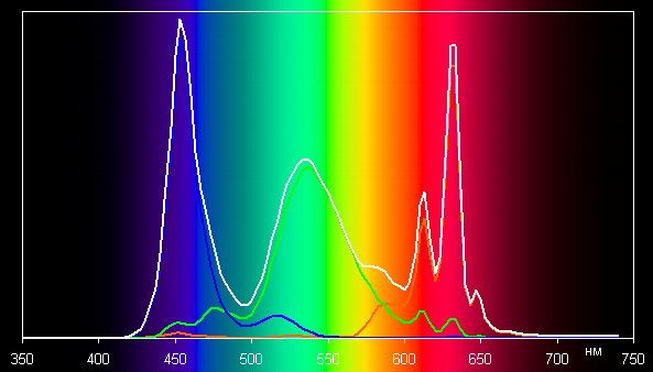 Поэтому визуально цвета на этом экране имеют естественную насыщенность. Ниже приведен спектр для белого поля (белая линия), наложенный на спектры красного, зеленого и синего полей (линии соответствующих цветов):