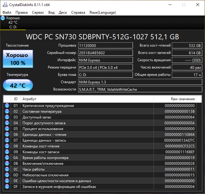 | Накопитель | 1×SSD 512 ГБ (WD SN730, M.2 2280, NVMe, PCIe 3.0 x4) | |
