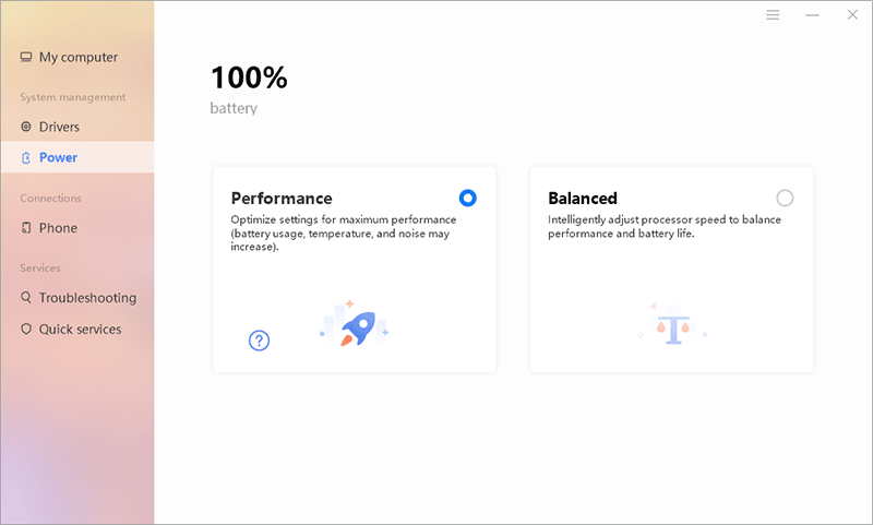 Скорость вращения вентилятора регулируется автоматически в зависимости от температуры процессора и режима работы ноутбука, который можно выбрать в приложении из двух вариантов: производительный или сбалансированный.