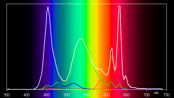 Поэтому визуально цвета на этом экране имеют естественную насыщенность. Ниже приведен спектр для белого поля (белая линия), наложенный на спектры красного, зеленого и синего полей (линии соответствующих цветов):