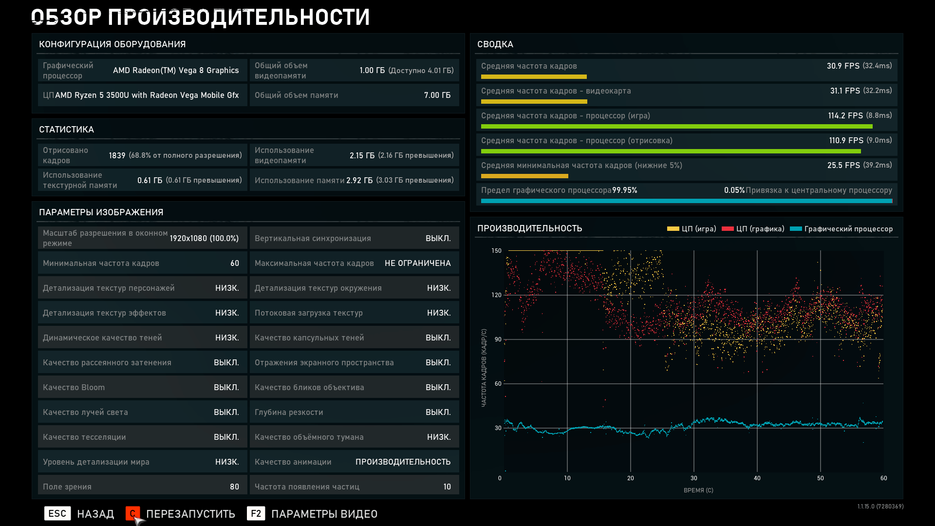 По данным встроенного теста производительности, средний FPS составил почти 30 кадров в секунду, а минимальный не опускался ниже 22.
