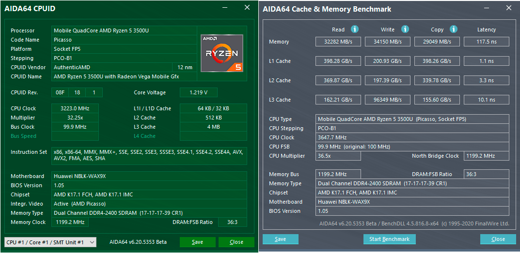 Для начала очень кратко напомним основную аппаратную конфигурацию ноутбука. В его основе лежит процессор AMD Ryzen 5 3500U с 4 ядрами и 8 потоками, работающий на частотах от 2,1 до 3,7 ГГц. Оперативная память DDR4 распаяна на плате в объёме восемь гигабайт на частоте 2,4 ГГц с таймингами 17-17-17-39 CR1.
