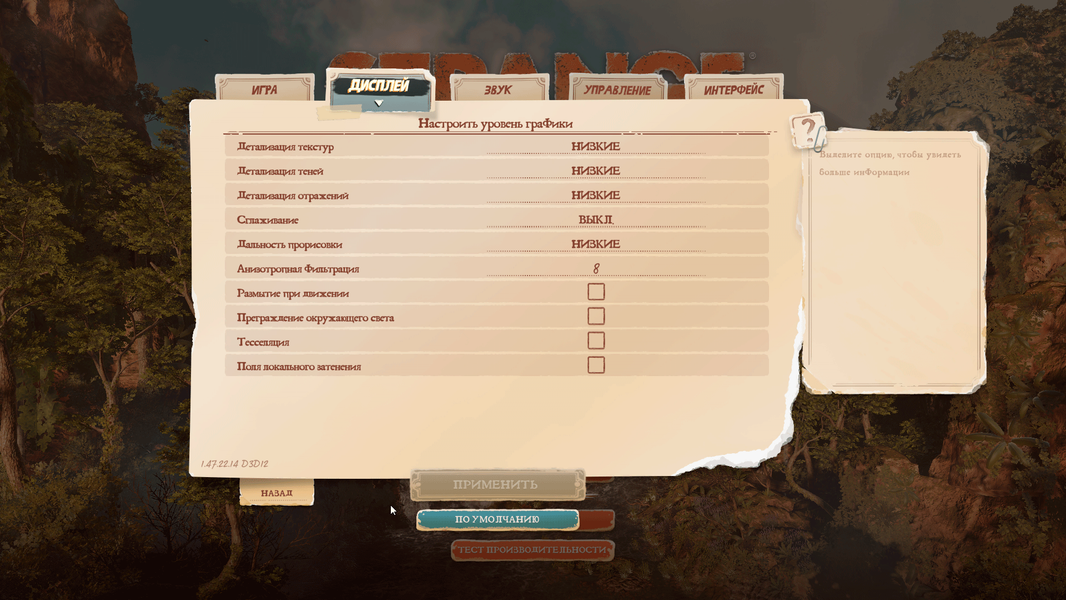Для получения более-менее приемлемой производительности Honor MagicBook 14 в уже далеко не новой игре Strange Brigade, вышедшей более 1,5 лет назад, нам пришлось снизить настройки до минимальных, не считая анизотропную фильтрацию, которая не влияет на результаты теста, а также отключить всевозможные дополнительные технологии улучшения качества графики.