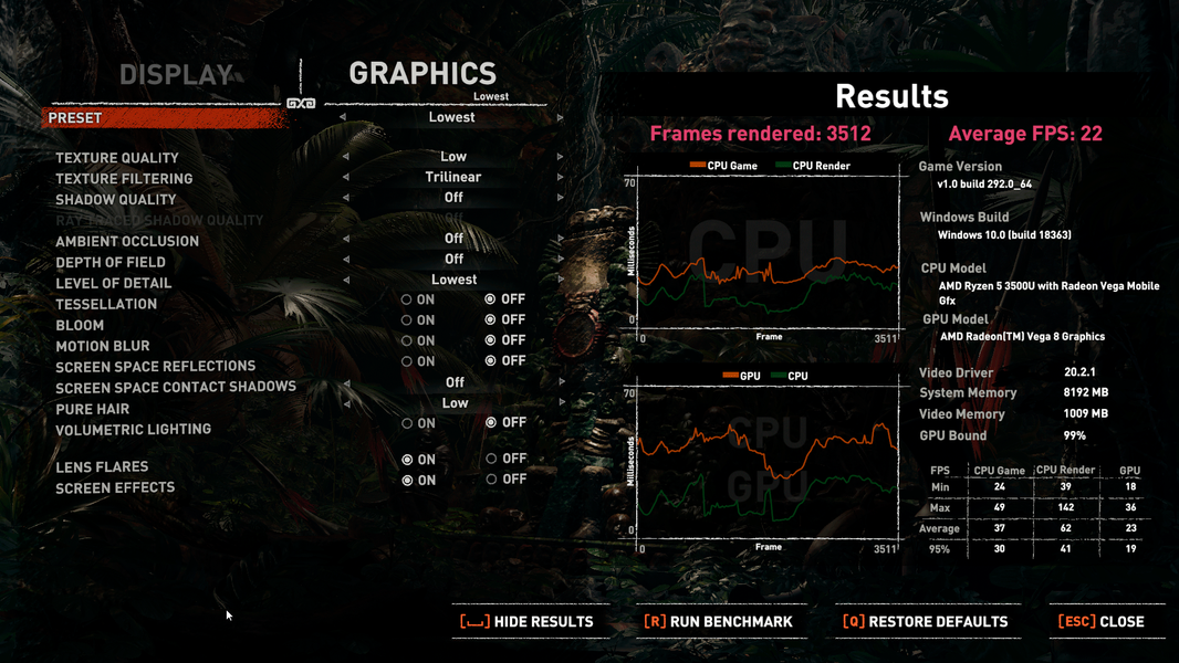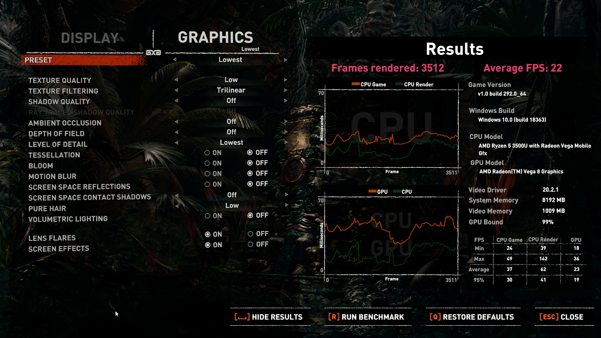Очередное 3D-приключение Лары Крофт также вышло 1,5 года назад, но и сейчас игра с лёгкостью может поставить на колени даже самые топовые конфигурации, в особенности в разрешении 4K. Однако нас сегодня интересует хоть какой-то уровень производительности в FullHD, поэтому мы сразу же выставили минимальные настройки качества и отключили все эффекты.