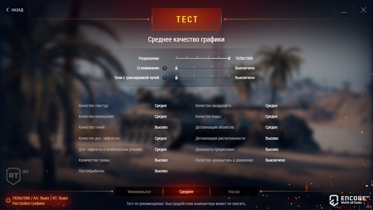 | World of Tanks enCore RT | Октябрь 2019 г. | 1920х1080 | Средние | 43 | 26 |