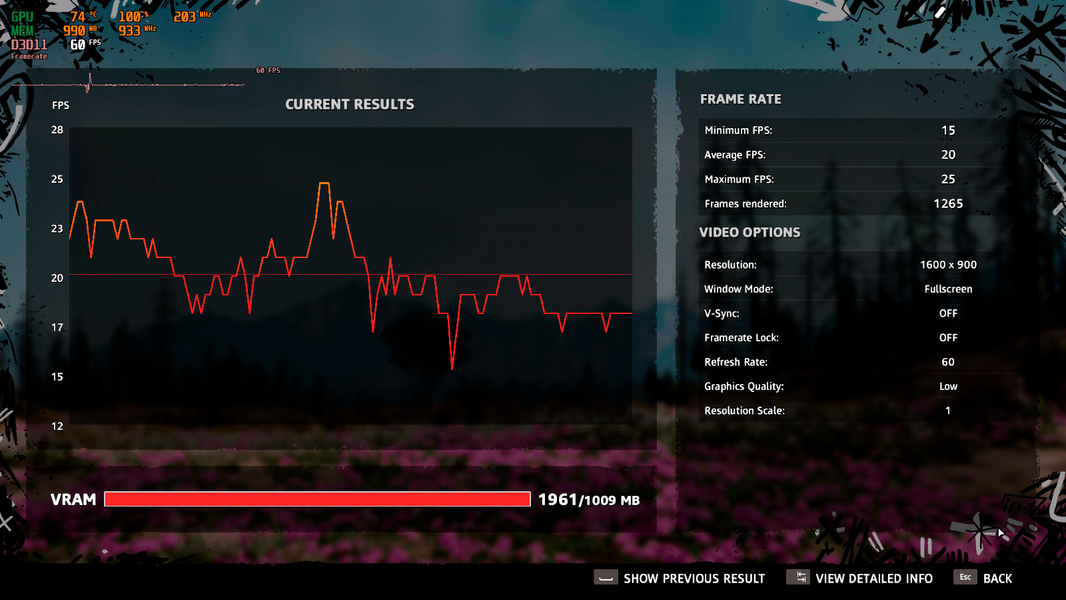 Результатом бенчмарка в уменьшенном разрешении стало среднее число кадров в секунду на уровне 20 при минимальном на уровне 15.