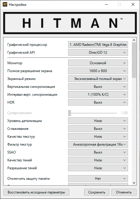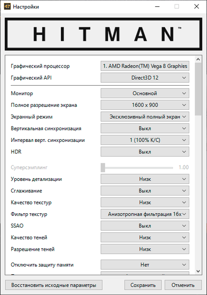 Hitman 2016 года в своё время была весьма ресурсоёмкой игрой, как и актуальная сейчас Hitman 2, поэтому для запуска этой игры на встроенной в процессор AMD Ryzen 5 3500U графике нам пришлось не только минимизировать настройки качества, но и снизить разрешение с 1920х1080 до 1600х900 пикселей.