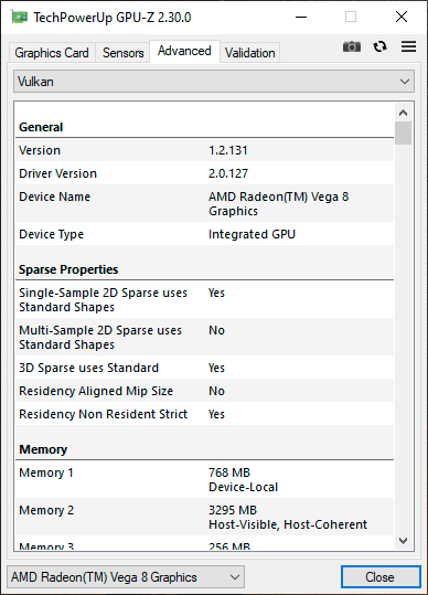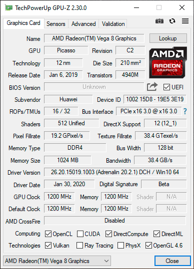 Встроенное в процессор графическое ядро AMD Radeon Vega 8 имеет 512 шейдерных процессоров, 1 ГБ выделенной видеопамяти на 128-битной шине и работает на частоте до 1,2 ГГц.