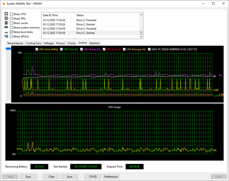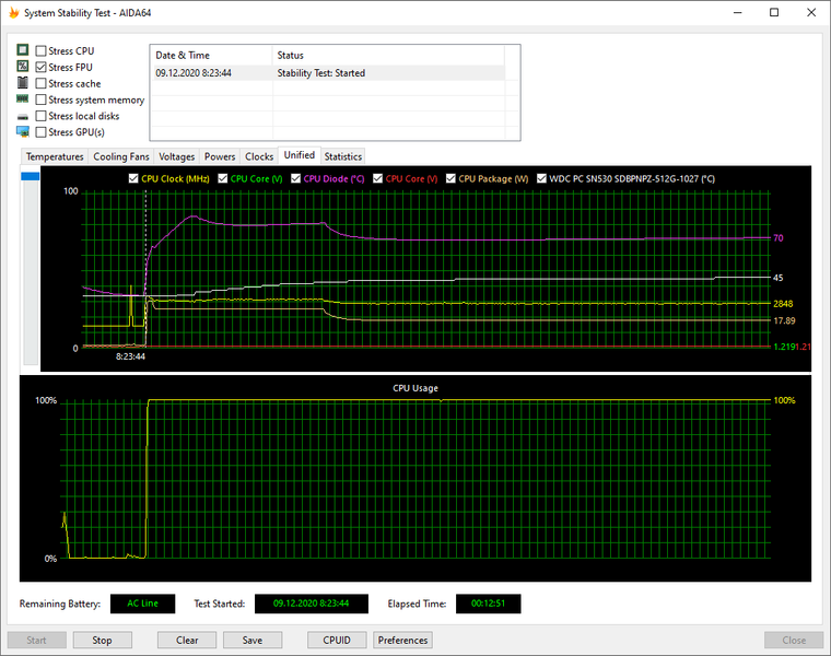 Эффективность охлаждения центрального процессора в ноутбуке мы тестировали с помощью стресс-теста FPU из утилиты AIDA64 Extreme, который задействует ресурсоемкие инструкции AVX. Температура в помещении во время теста составляла 25 °C. Ноутбук был протестирован как при работе от адаптера питания и электросети, так и при работе от аккумулятора. Результаты получились следующие.