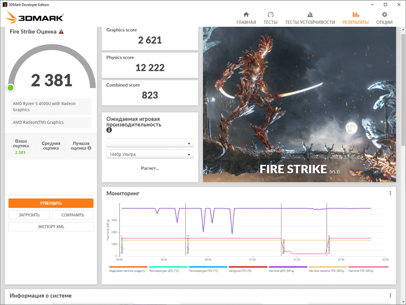 Понятно, что ноутбук не игровой, на встроенном в процессор графическом ядре далеко не уедешь, хотя оно, конечно, лучше типичной встроенной графики мобильных процессоров Intel. Но просто для справки мы прогнали три теста бенчмарка 3DMark и тест World of Tanks enCore RT на средних настройках качества.