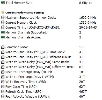 | Оперативная память | 2×4 ГБ DDR4-2666 (распаяны на плате), тайминги 20-19-19-43 CR1 | |