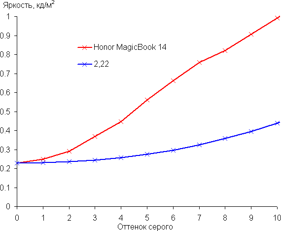 Аппроксимация полученной гамма-кривой дала показатель 2,22, что очень близко к стандартному значению 2,2, при этом реальная гамма-кривая немного отклоняется от аппроксимирующей степенной функции: