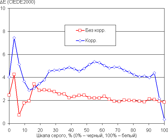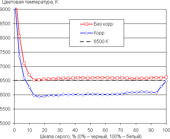 Баланс оттенков на шкале серого хороший (графики Без корр. на рисунках ниже), так как цветовая температура близка к стандартным 6500 К, и отклонение от спектра абсолютно черного тела (ΔE) даже ниже 3, что для потребительского устройства считается отличным показателем. При этом цветовая температура и ΔE мало изменяются от оттенка к оттенку — это положительно сказывается на визуальной оценке цветового баланса. (Самые темные области шкалы серого можно не учитывать, так как там баланс цветов не имеет большого значения, да и погрешность измерений цветовых характеристик на низкой яркости большая.)
