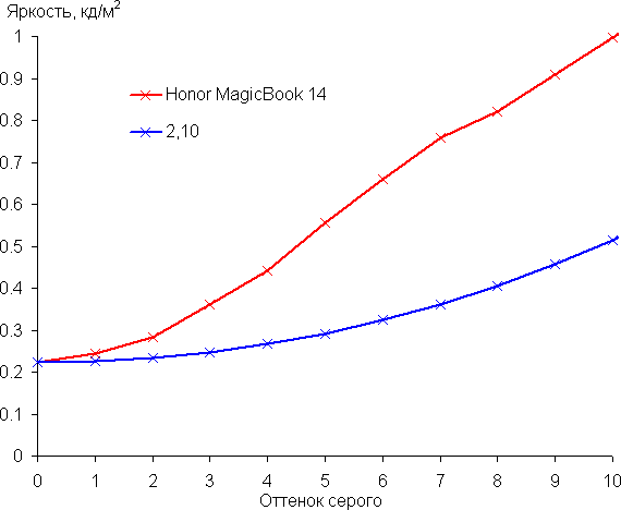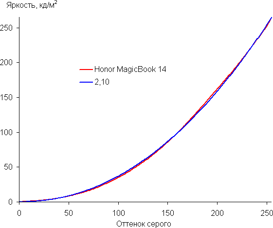 Аппроксимация полученной гамма-кривой дала показатель 2,10, что чуть ниже стандартного значения 2,2, при этом реальная гамма-кривая немного отклоняется от аппроксимирующей степенной функции: