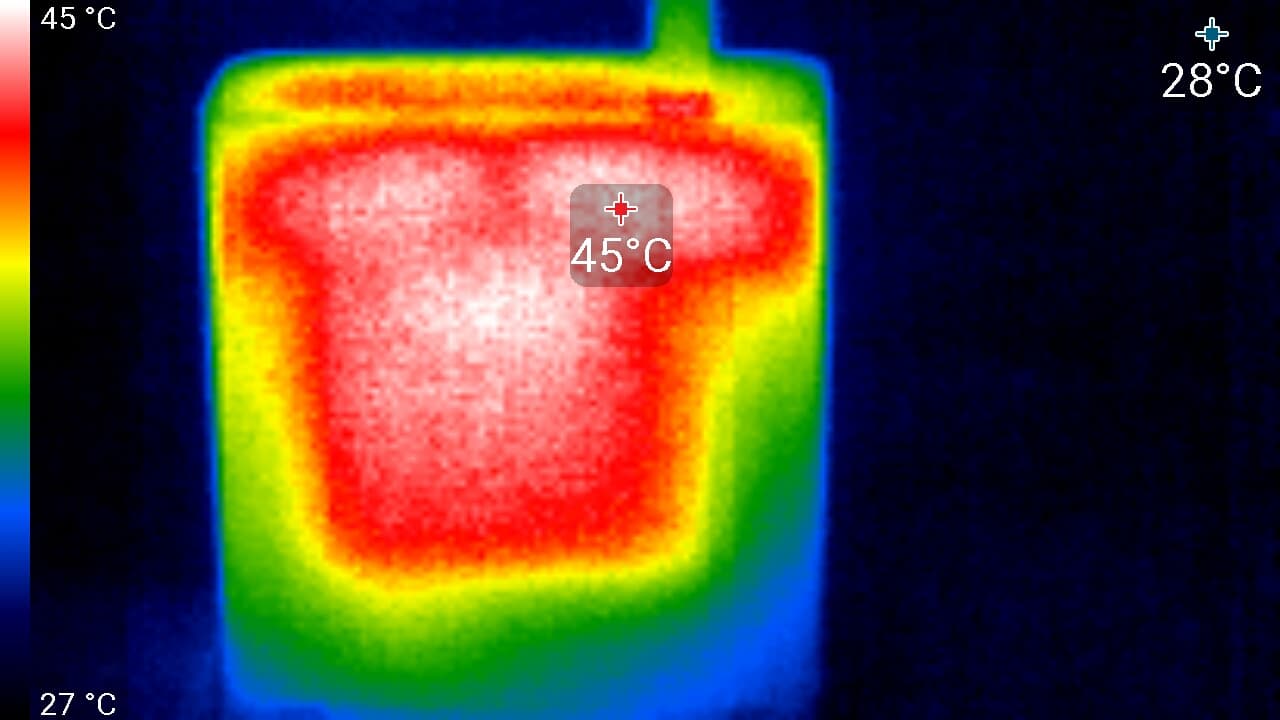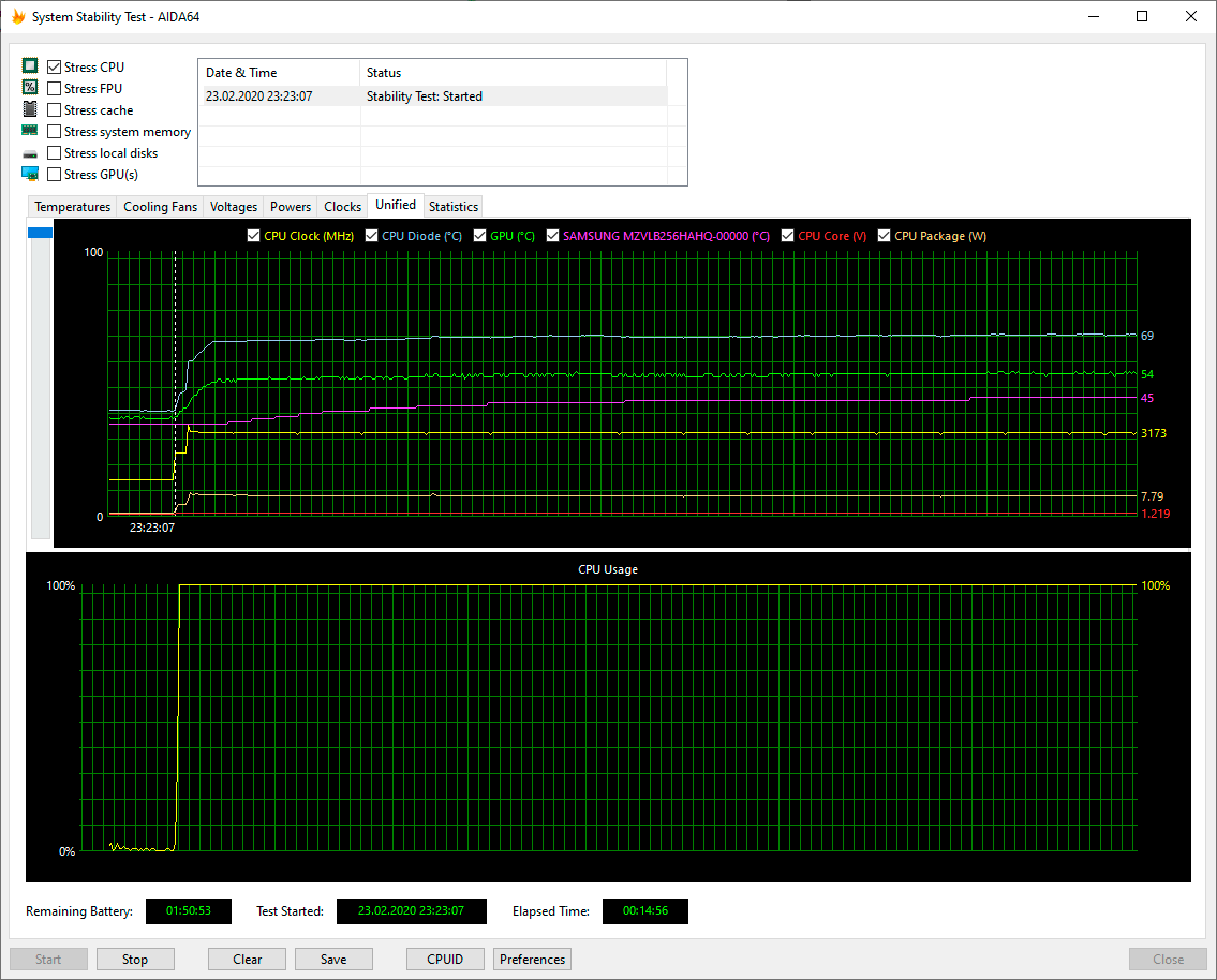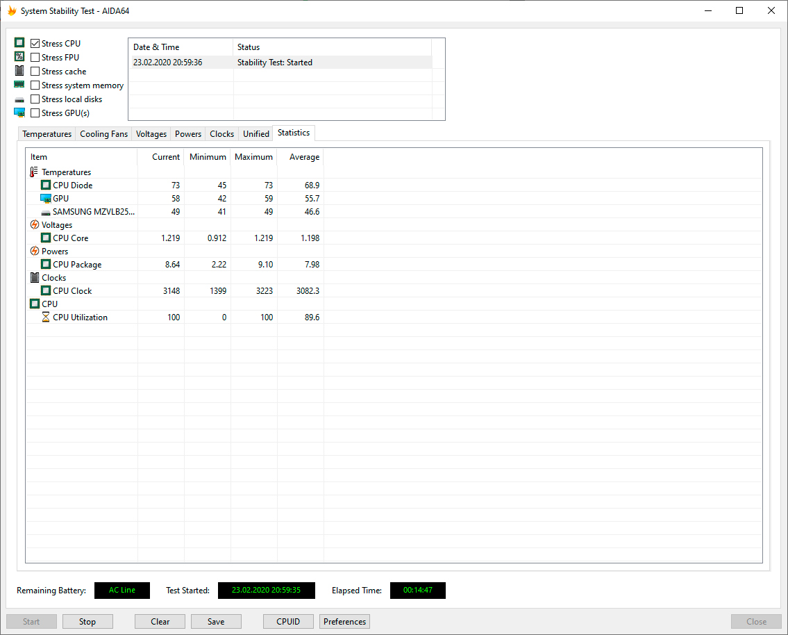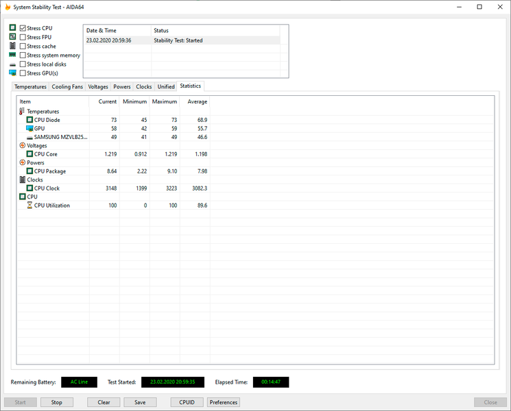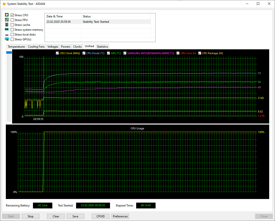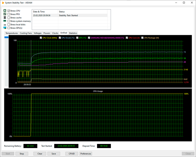 В первом тесте, когда ноутбук работал в режиме максимальной производительности при питании от электросети, максимальная температура процессора достигала 73 °C при напряжении 1,2 В и частоте 3,15 ГГц.