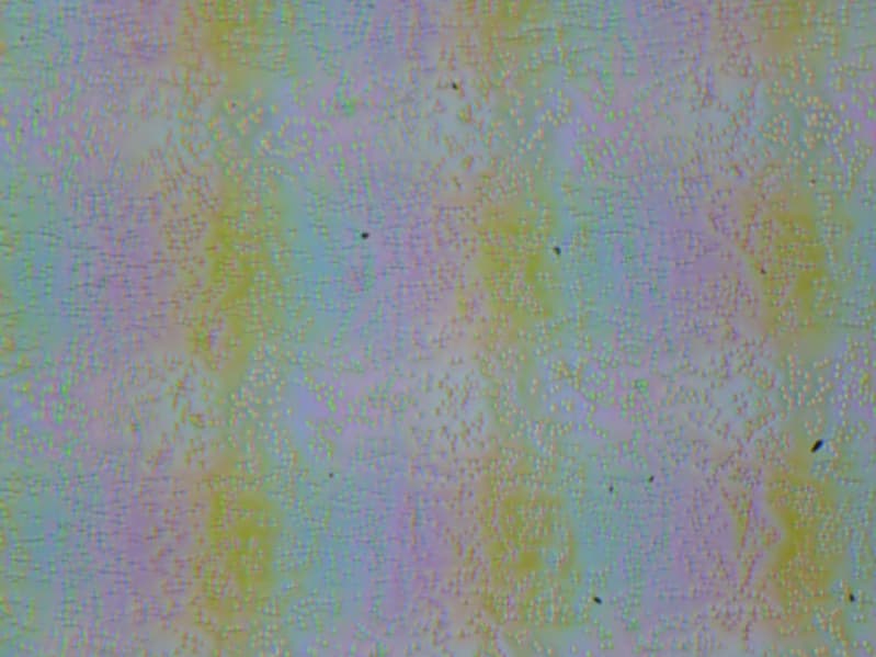Зерно этих дефектов в несколько раз меньше размеров субпикселей (масштаб этих двух фотографий примерно одинаковый), поэтому фокусировка на микродефектах и «перескок» фокуса по субпикселям при изменении угла зрения выражены слабо, из-за этого нет и «кристаллического» эффекта.