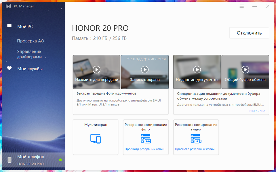 MagicBook 14 поставляется с предустановленой фирменной утилитой PC Manager. Она может в том числе «оптимизировать систему» (в ее понимании) — например, проверяя наличие свежих драйверов. Но самые интересные ее функции касаются связи со смартфонами того же производителя.