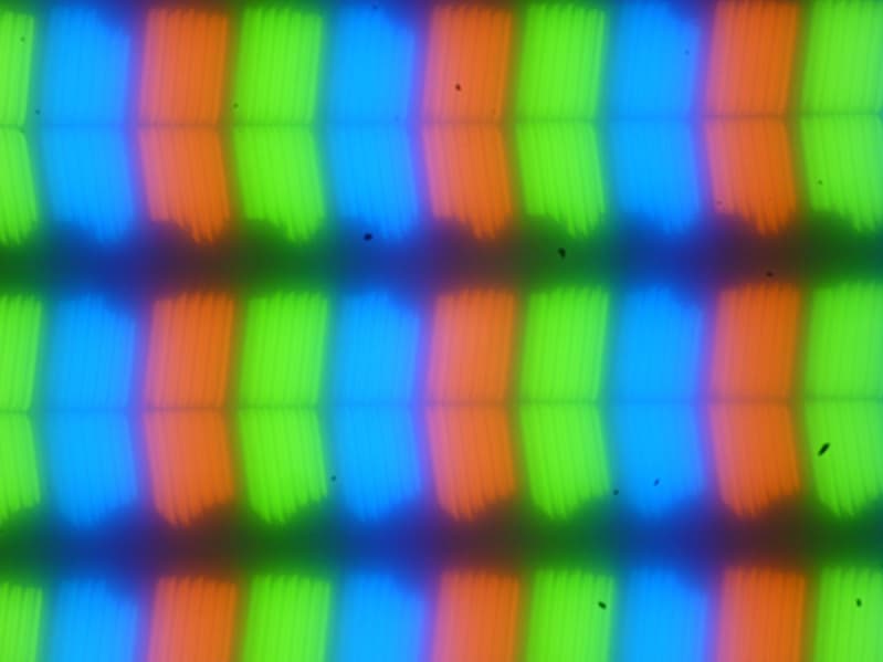 В этом ноутбуке используется матрица типа IPS. Микрофотографии демонстрируют типичную для IPS структуру субпикселей (черные точки — это пыль на матрице фотоаппарата):