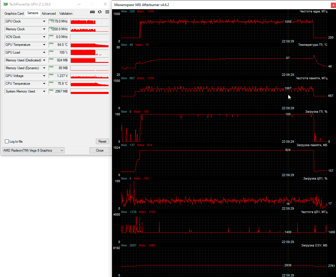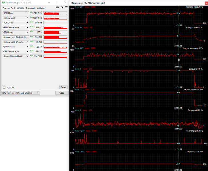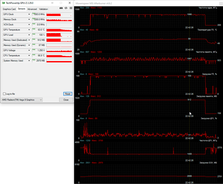 Температуры AMD Radeon Vega 8 в этих режимах оказались практически одинаковыми.