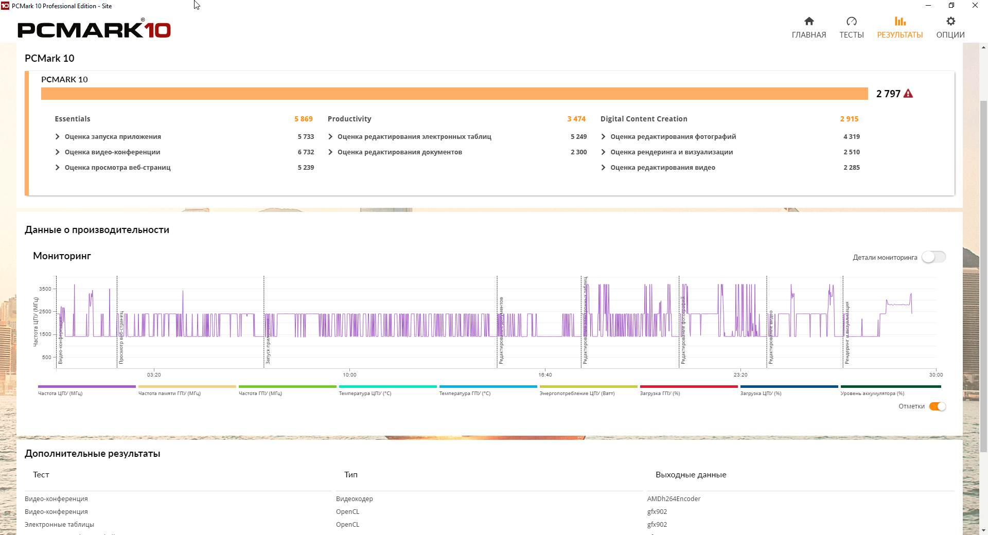Примерно одинаково ведет себя в двух режимах работы и встроенное в процессор графическое ядро AMD Radeon Vega 8, нагружаемое стресс-тестом Fire Strike из 3DMark. Правда, при питании от аккумулятора изменение частоты ядра больше, чем при питании от электросети, где она более стабильна.