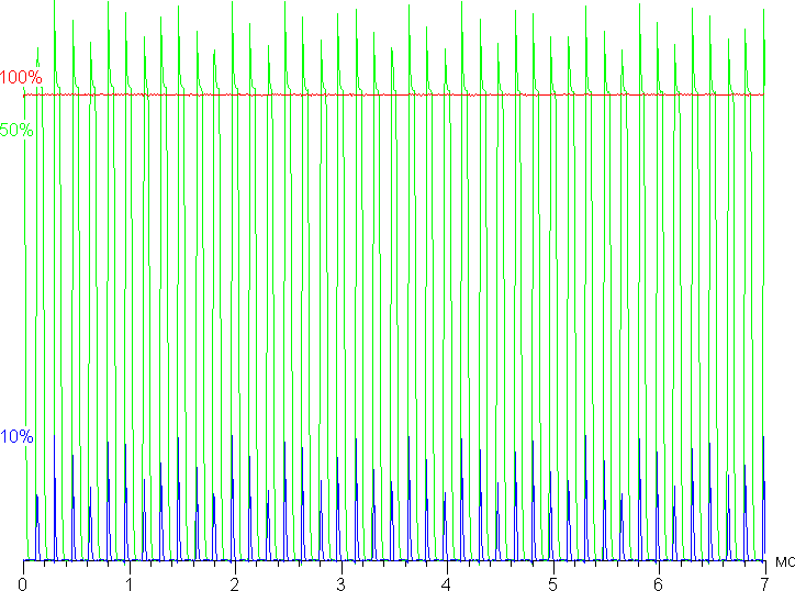 Яркость регулируется с помощью ШИМ, однако частота модуляции очень высокая, порядка 6 кГц, поэтому никакого мерцания не видно ни при каких обстоятельствах, также наличие модуляции не выявляется в тесте на стробоскопический эффект. Приведем графики зависимости яркости (вертикальная ось) от времени (горизонтальная ось) при различных значениях настройки яркости: