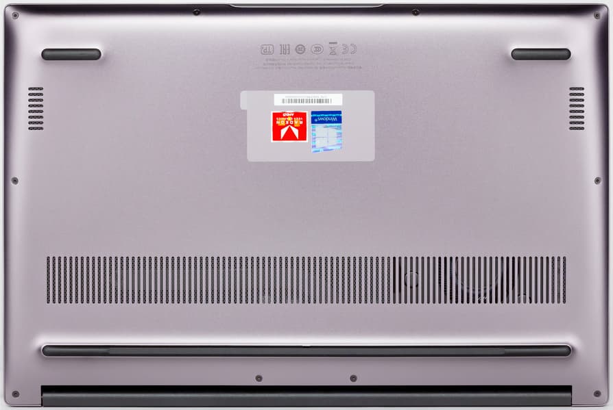 На основании корпуса ноутбука выделим резиновые ножки, боковые прорези под акустику и длинную перфорированную зону под вентиляцию системы охлаждения.