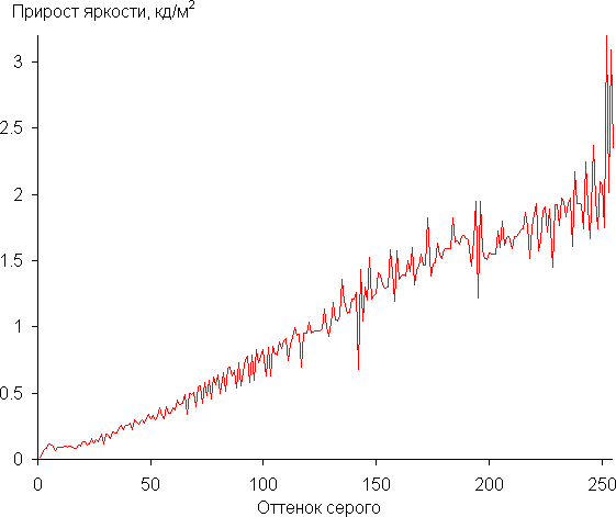 Далее мы измерили яркость 256 оттенков серого (от 0, 0, 0 до 255, 255, 255) при настройках по умолчанию. График ниже показывает прирост (не абсолютное значение!) яркости между соседними полутонами: