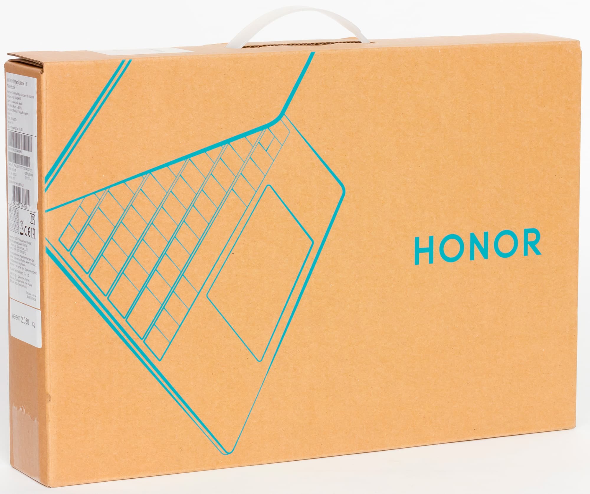 Honor MagicBook 14 запечатан в компактную картонную коробку с пластиковой ручкой для переноски. На коробке указано только название бренда, а с торца приклеена информационная наклейка с кратким перечислением характеристик модели.