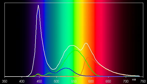 Ниже приведен спектр для белого поля (белая линия), наложенный на спектры красного, зеленого и синего полей (линии соответствующих цветов):